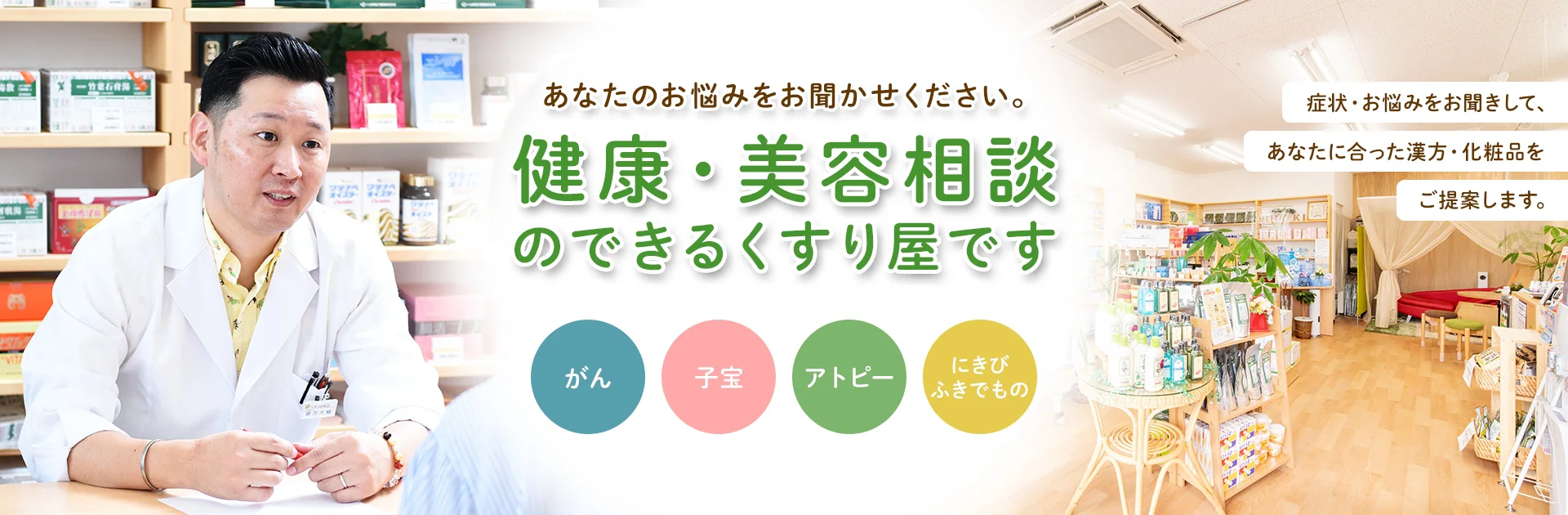 くすりの共立は、心も体も真に健康に元気になっていただくためのお手伝いをしています。体に負担をかけない漢方薬、健康食品、化粧品を「お客様が家族だったら」との思いで、実際、私や家族が使っていたり、飲んでいたりしている物、また必要になった時に飲みたいと思う物を中心に取り扱っています。